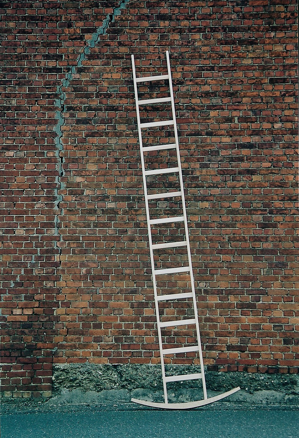 Het kunstwerk van Roel Vandebeek toont een lange ladder die nooit stabiel kan staan. Wie probeert erop te klimmen, merkt al snel dat elke poging eindigt met een tuimeling. De ladder – normaal een symbool van vooruitgang – verandert zo in een object dat voortdurend onderuitgaat.
